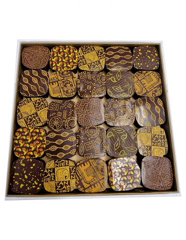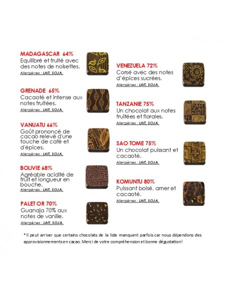 Coffret de 25 chocolats fins à base de ganache au chocolat noir avec des cacaos d'origines différentes. Un voyage au cœur de différents pays producteur de cacao.