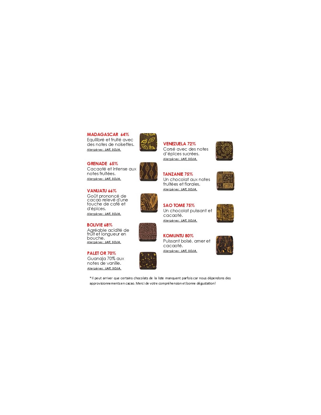 Ingrédients : chocolat noir : Madagascar 64%, Grenade 65%, Guanaja 70%, Vénézuela 72%, Tanzanie 75%, Sao Tomé 75%, Komuntu 80% : fèves de cacao, sucre, beurre de cacao, émulsifiant : lécithine de tournesol et de SOJA, CREME fraîche à 35% de MG (LAIT), sirop de glucose, sucre inverti, sorbitol, BEURRE frais, (LAIT), vanille en poudre de Madagascar. Colorants alimentaires des décors : cacao en poudre, charbon végétal, curcumine, carmin, anthocyanes, concentrés de carthame, radis, cassis et pomme, arôme naturel de vanille.