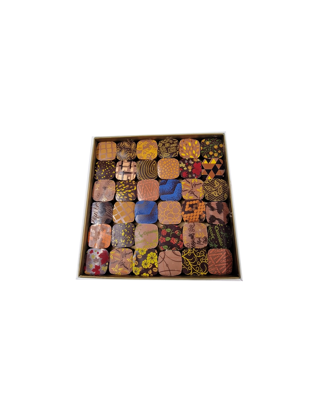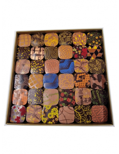 Un coffret de 36 chocolats fins assortis se composant de la façon suivante :