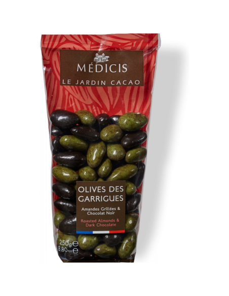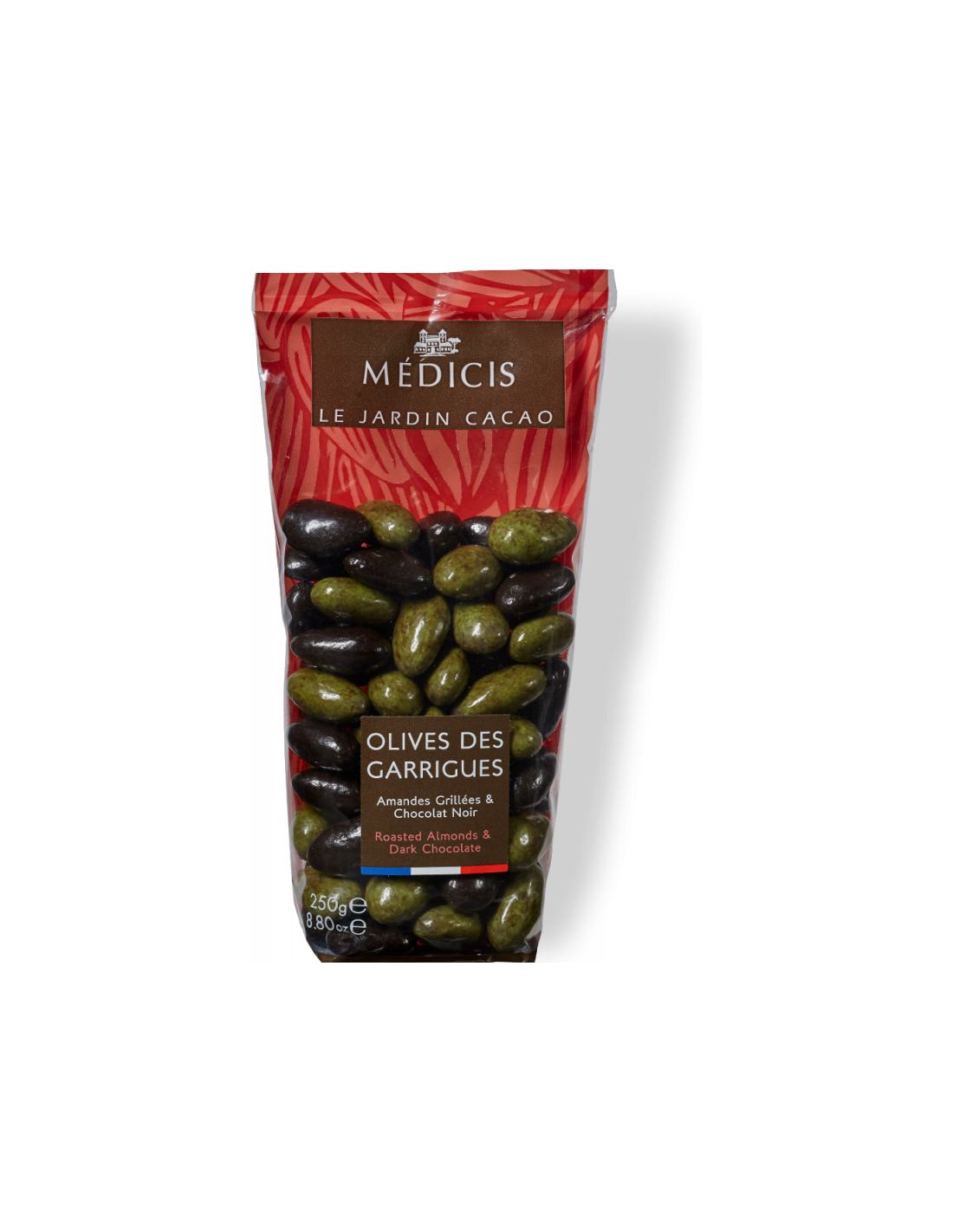 Une amande grillée enrobée de chocolat noir aux couleurs des olives de garrigues vertes et noires. Poids : 200g