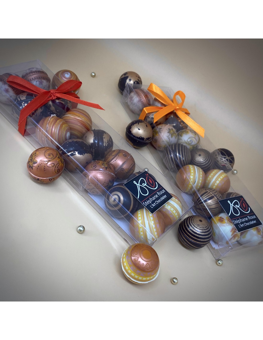 Petites billes de Noël avec une jolie coque en chocolat noir, lait ou blanc garnies de praliné fondant aux amandes. Poids : 135g