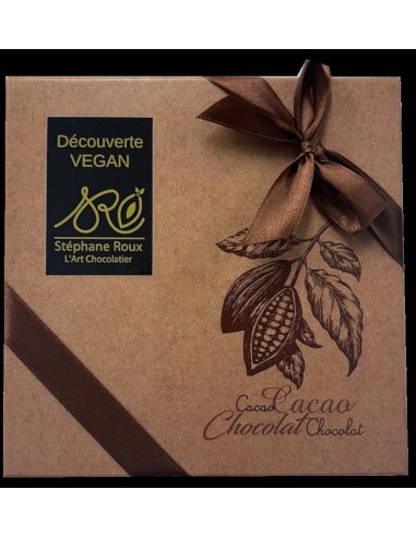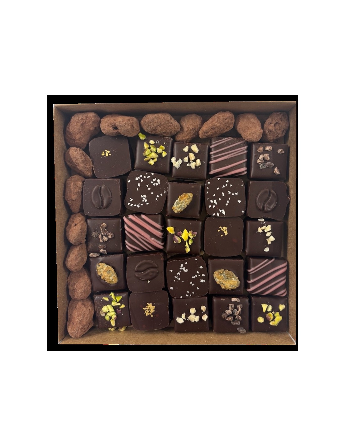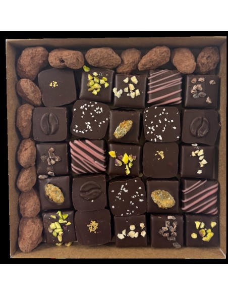 Coffret de 25 chocolats VEGAN à base de protéines de lentilles, accompagnés d'amandes torréfiées.