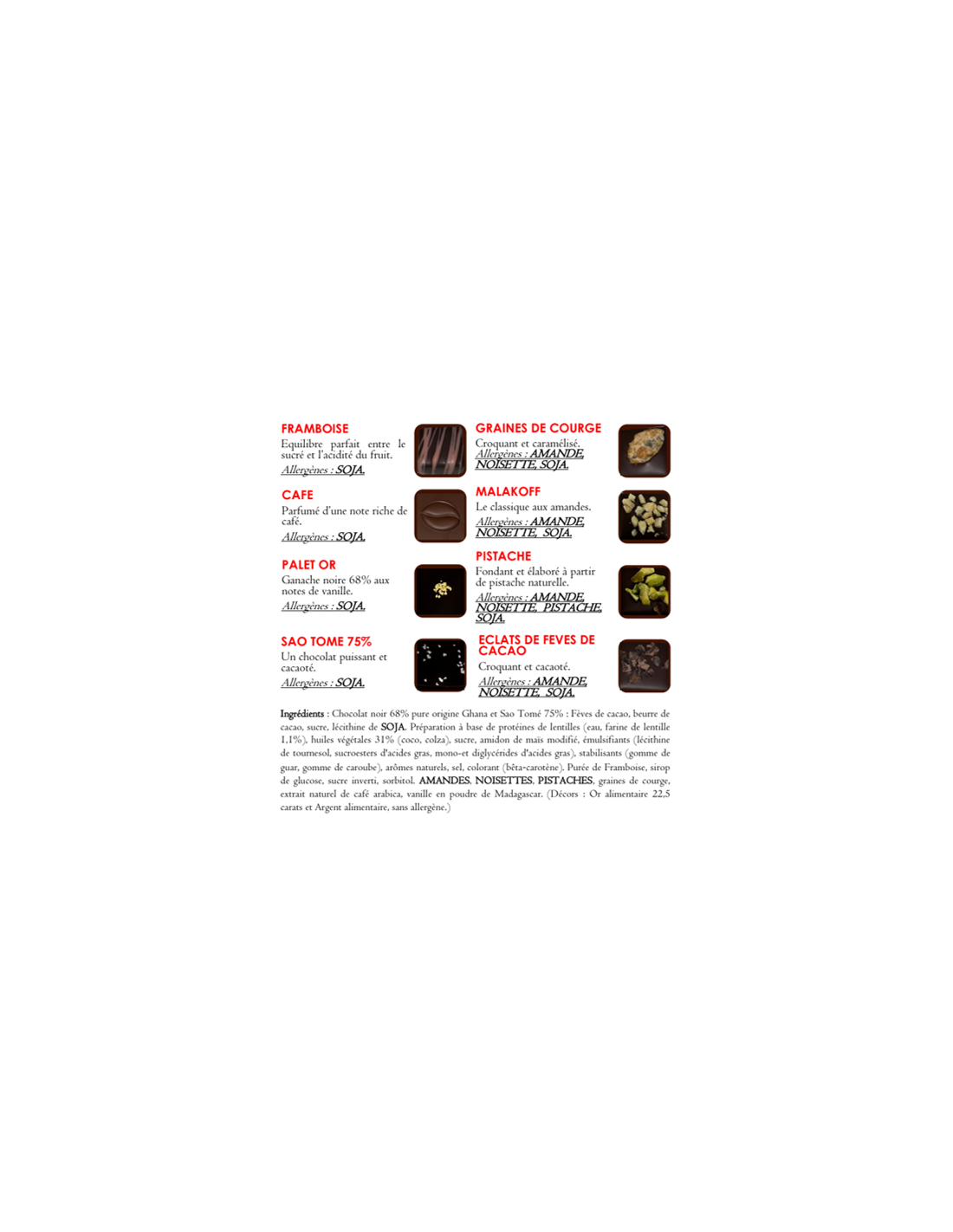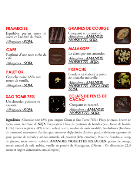 chocolat noir 68% de cacao pur Ghana et chocolat noir 75% pur Sao Tomé : fèves de cacao, beurre de cacao, sucre, lécithine de SOJA, préparation à base de protéines de lentilles (eau, farine de lentilles 1,1%), huiles végétales (colza, coco), sucre, amidon de maïs modifié, émulsifiants (lécithine de tournesol, sucroesters d'acide gras, mono et diglycérides d'acide gras), stabilisants (gomme de guar, gomme de caroube), arômes naturels, sel, colorant (bêta carotène), purée de framboise, sirop de glucose, sucre inverti, sorbitol, AMANDES, NOISETTES, PISTACHES, graines de courge, extrait naturel de café arabica, vanille en poudre de Madagascar. Décors : or alimentaire 22,5 carats et argent alimentaire sans allergènes).