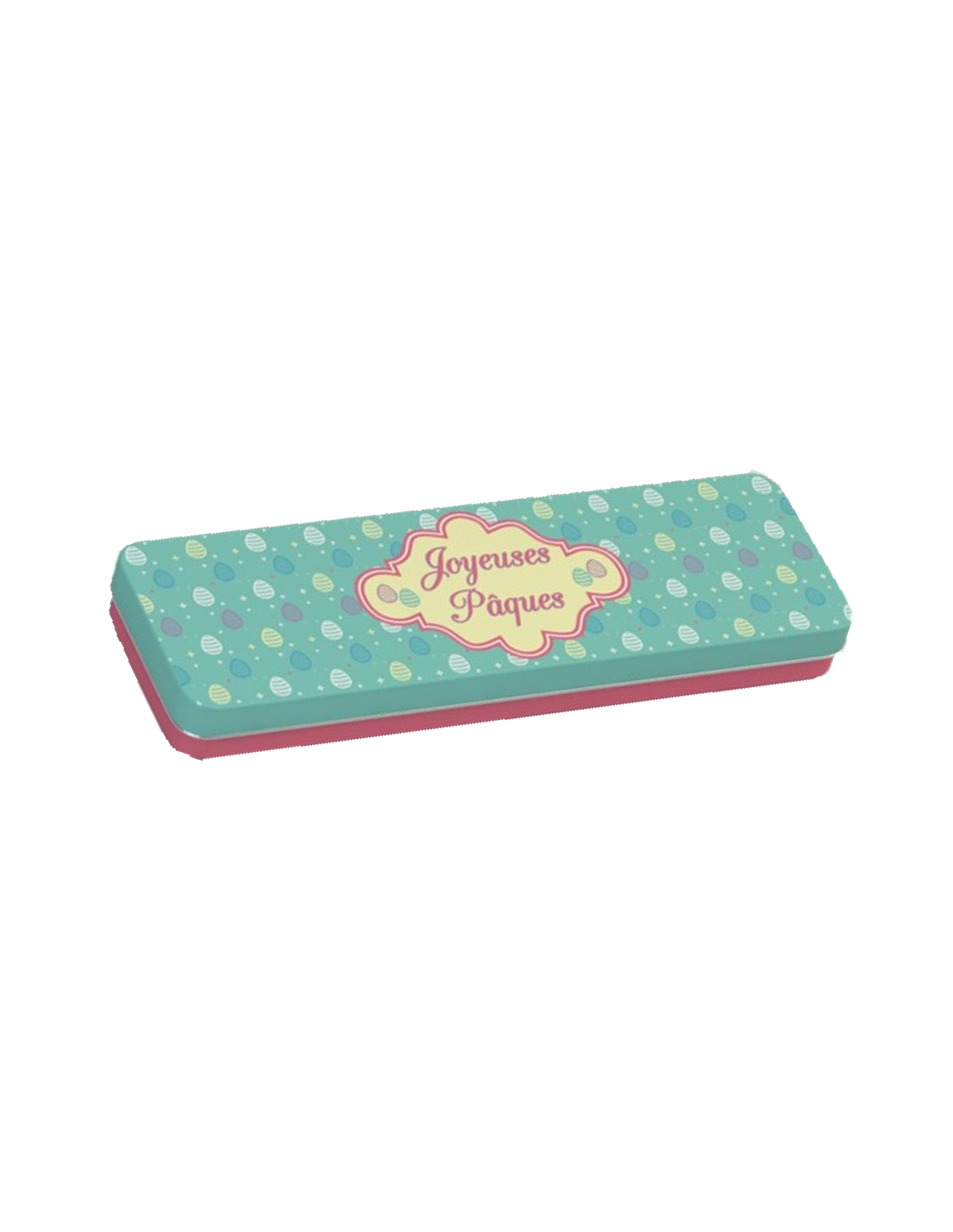 Joli Plumier "JOYEUSES PAQUES" garni de friture de Pâques et de petits œufs de garniture.