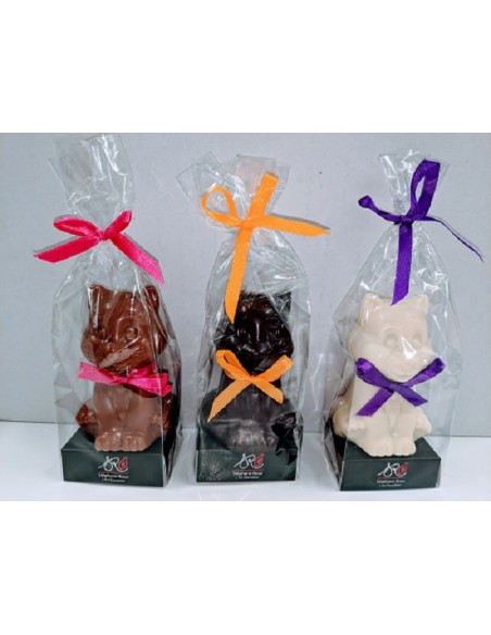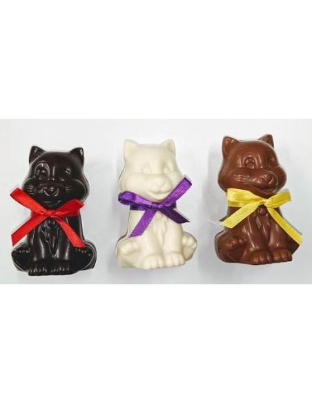 Chaton 70g décliné en chocolat noir 70%, lait 36% garni de friture, de petits œufs de garniture.