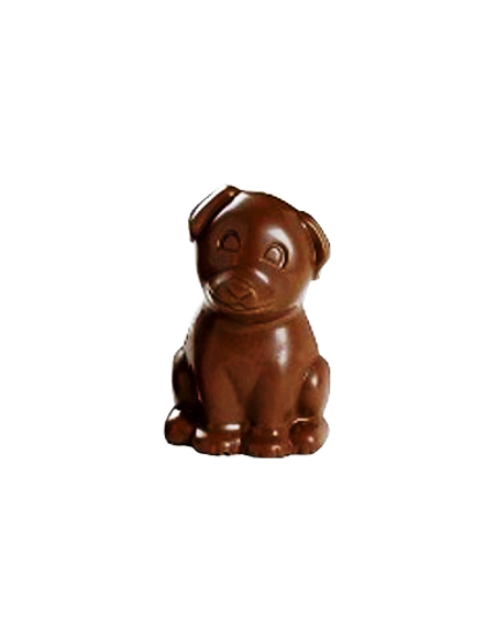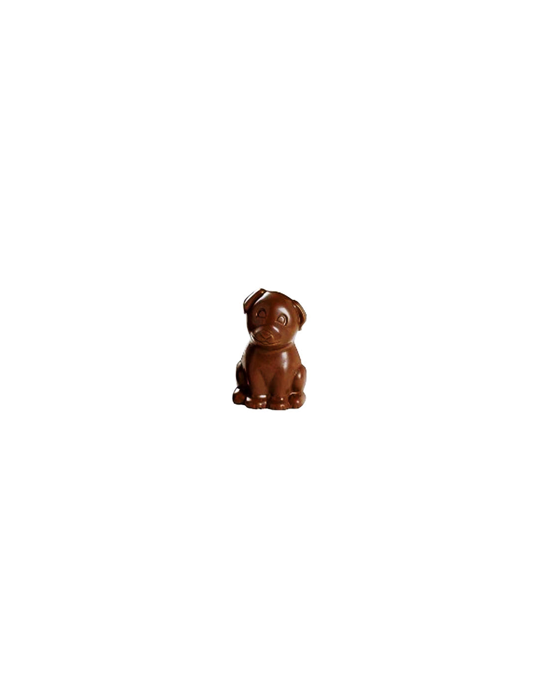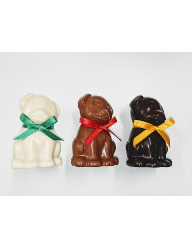 Chiot 70g décliné en chocolat noir 70%, lait 36% garni de friture, de petits œufs de garniture.