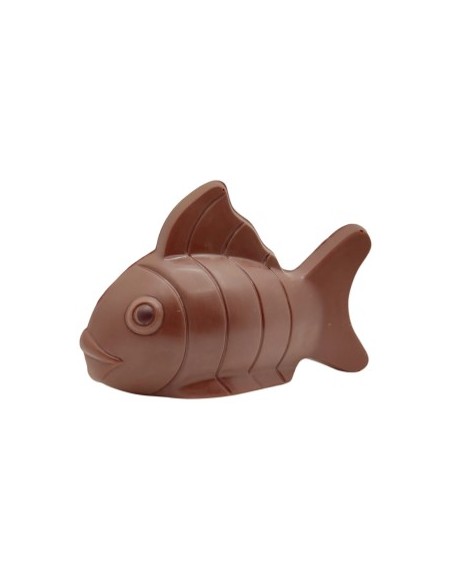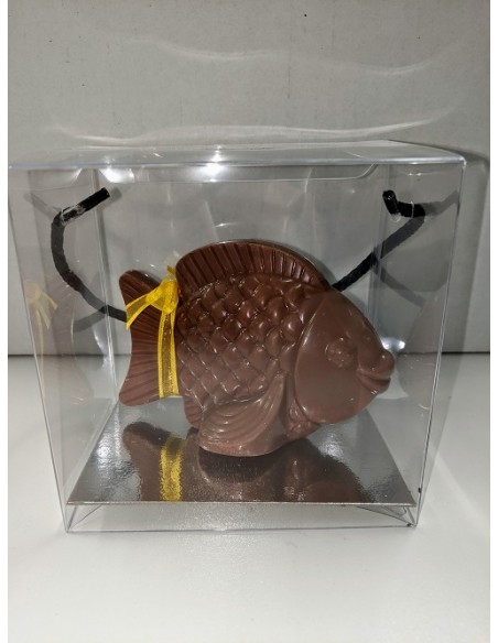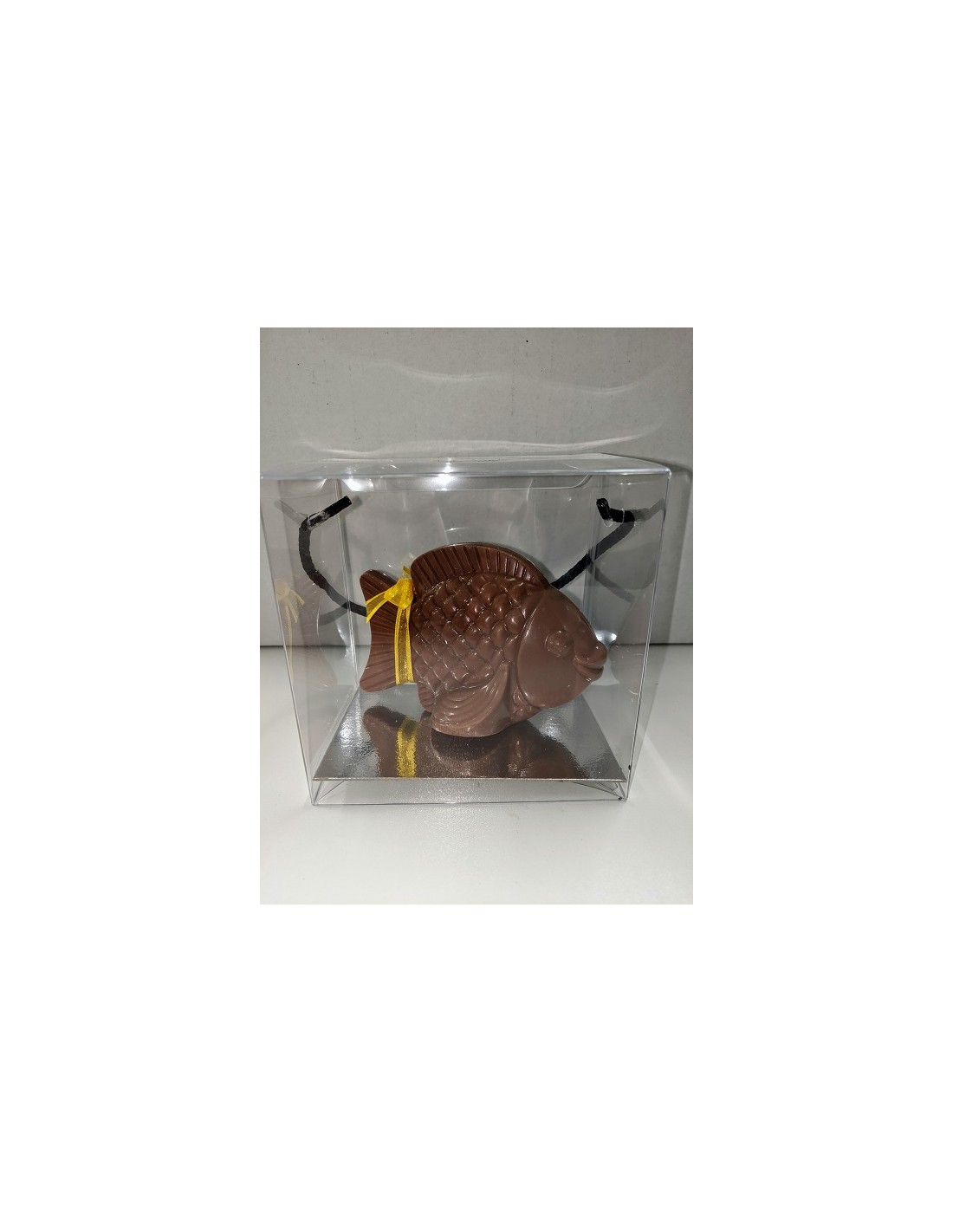 Poisson 110g décliné en chocolat noir 70% ou lait 36% garni de friture, de petits œufs de garniture.