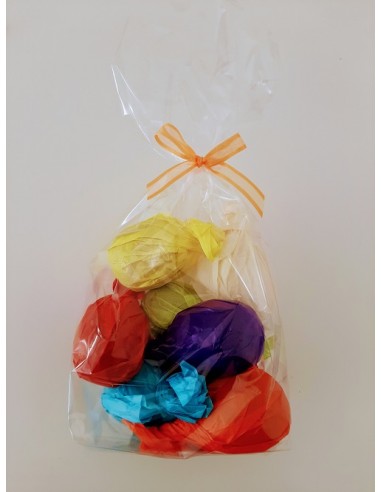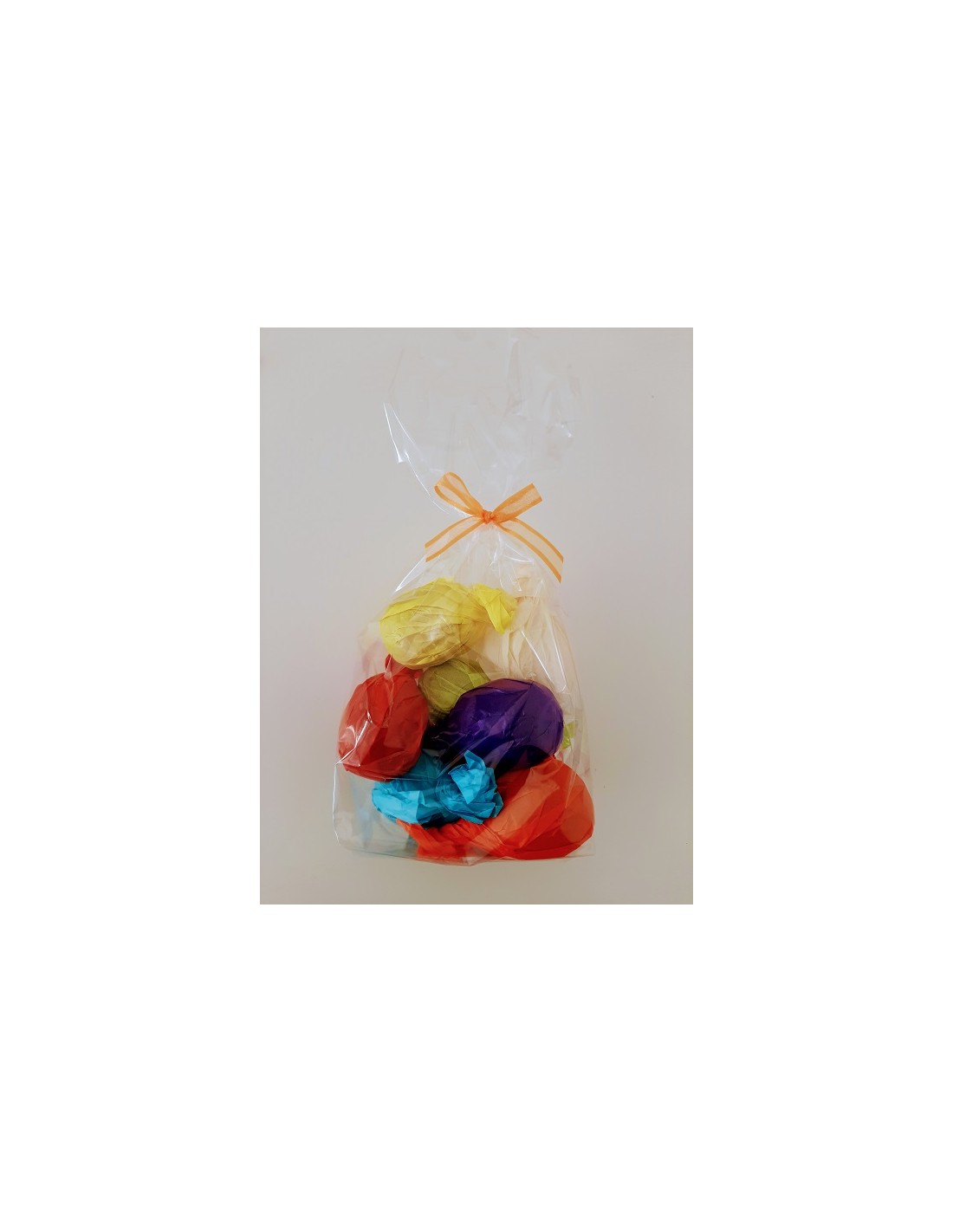 8 œufs en chocolat : 3 en chocolat noir, 3 en chocolat au lait et 2 en chocolat blanc garnis de friture, de petits œufs au chocolat et à la pulpe de fruits.