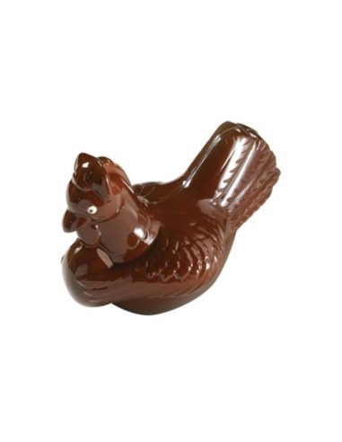 Poule 200g déclinée en chocolat noir 70% ou lait 36% garni de friture, de petits œufs de garniture.