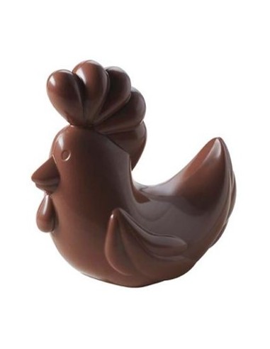 Coq majestueux 250g décliné en chocolat noir 70% ou lait 36% garnie de friture, de petits œufs de garniture.