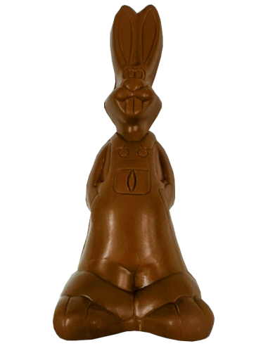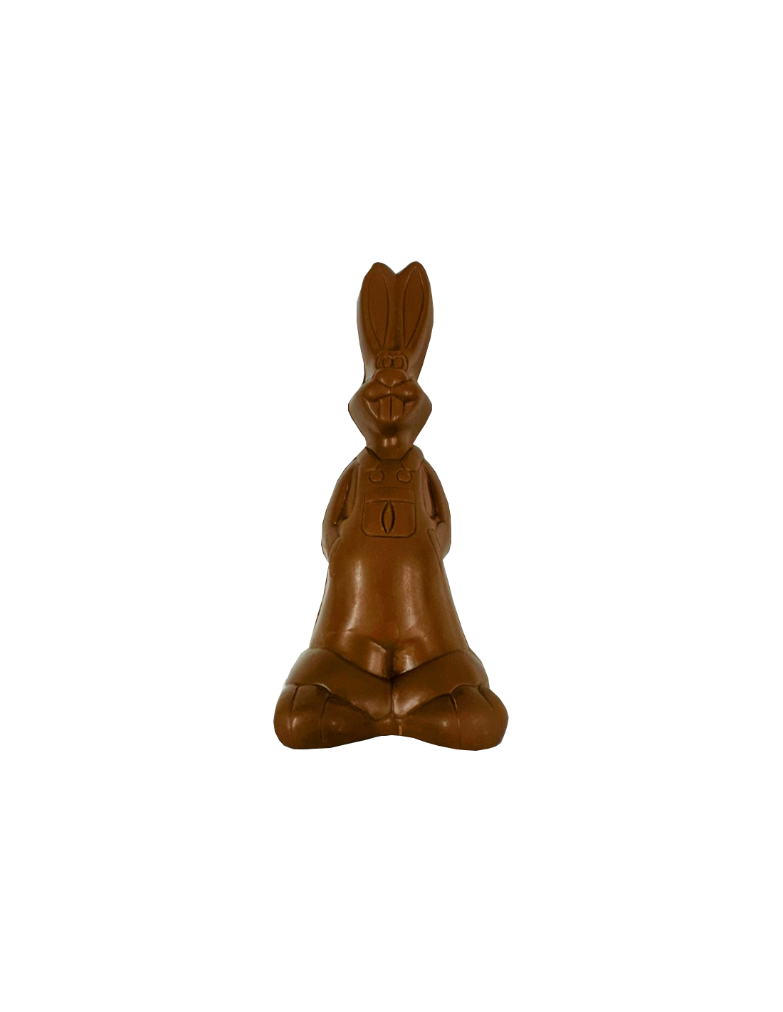 Lapin salopette 120g décliné en chocolat noir 70% ou lait 36% garni de friture et de petits œufs de garniture.