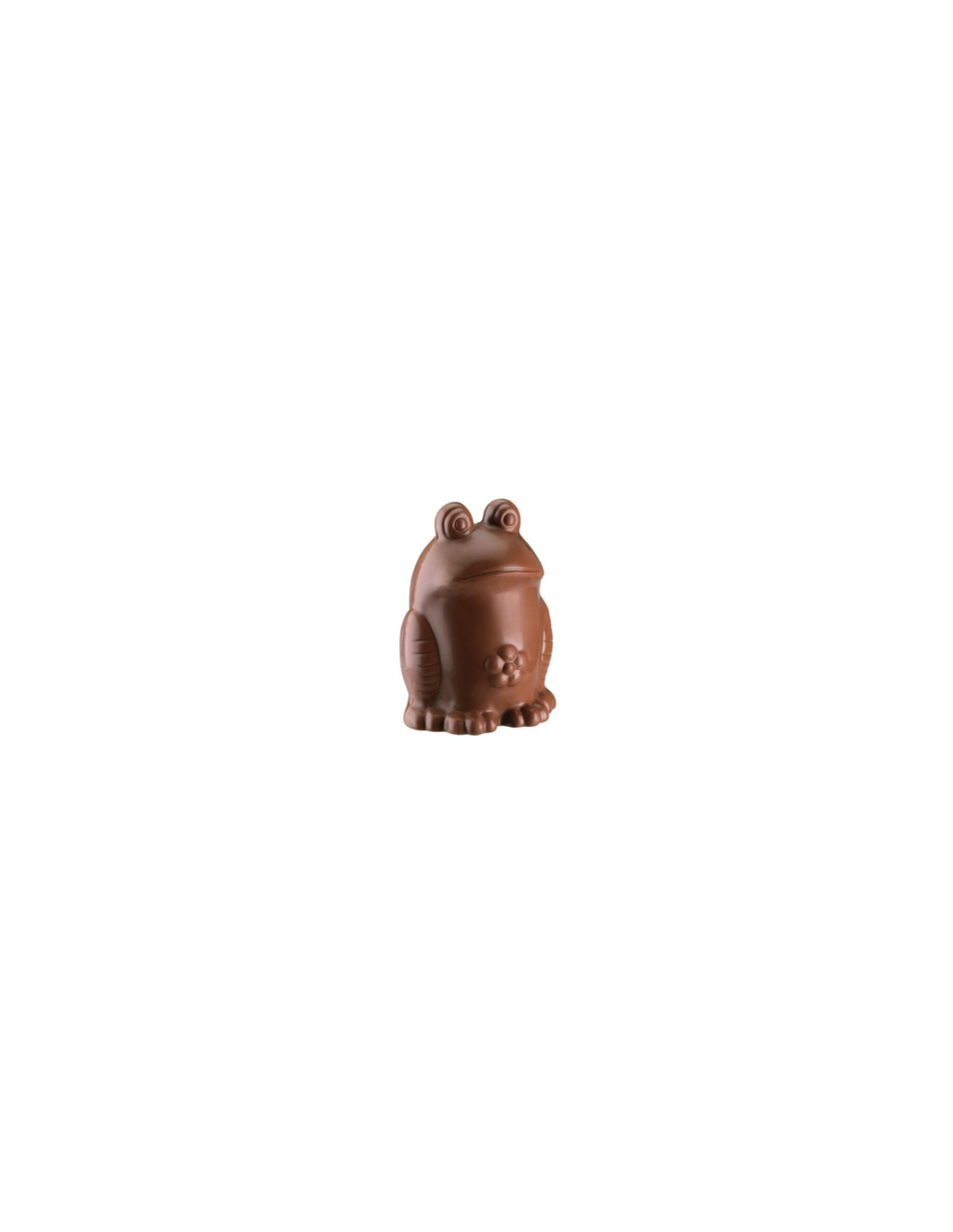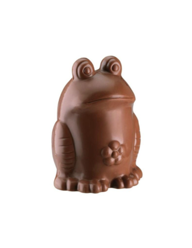 Grenouille 130g décliné en chocolat noir 70%, lait 36% garni de friture, de petits œufs de garniture.
