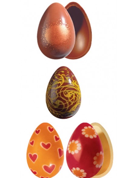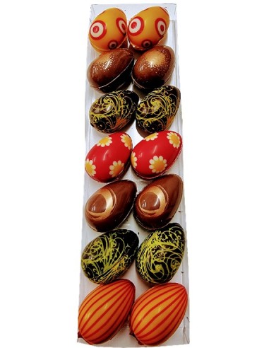 Ingrédients : fèves de cacao, beurre de cacao, sucre, LAIT entier en poudre, AMANDES, NOISETTES, lécithine de SOJA et de tournesol, arômes naturels de vanille, extrait naturel de vanille. Décors : beurre de cacao, sucre, colorants : phosphate de sodium, oxyde de fer, betanine, cacao maigre en poudre, concentré de carthame, et citron, concentré de radis, cassis, pomme.